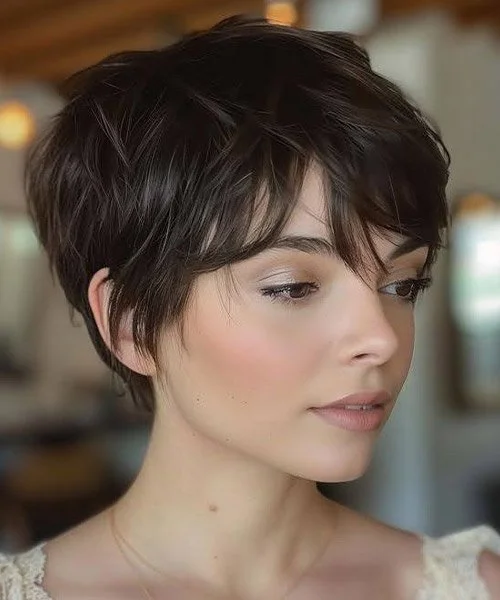 Corto, pero con capas sutiles alrededor del contorno del rostro e incluso un flequillo suave; ideal si quieres un corte corto pero con un toque delicado y femenino.